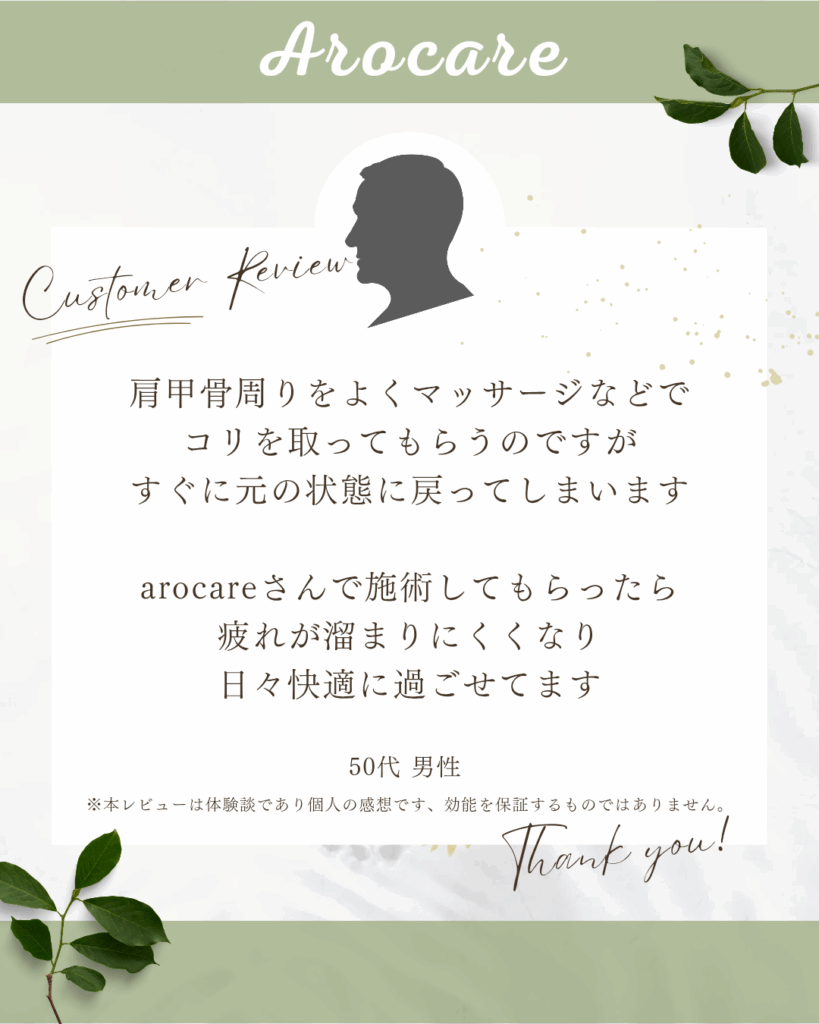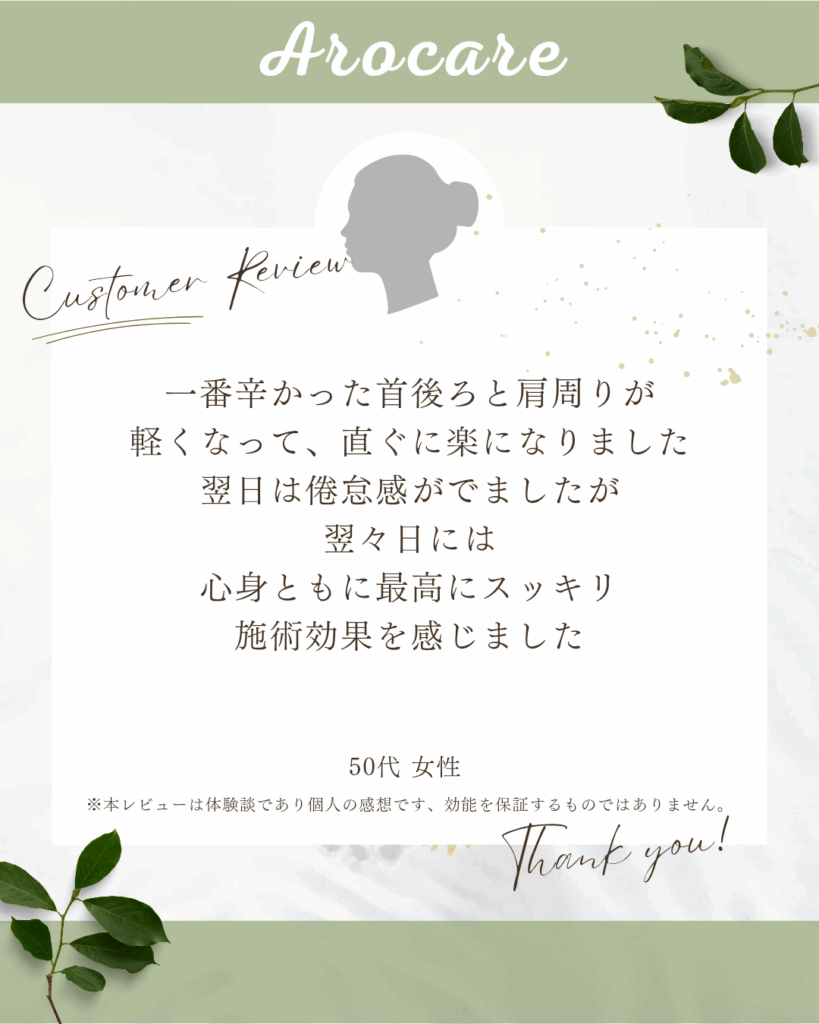 そこに、ツボを的確にとらえる指圧の圧を重ねることで『天然のアロマ成分・香り・技術』が三位一体となり単なるリラクゼーションを超えた「深い解放感」と「長く続く軽やかさ」を ご体感いただけます。
